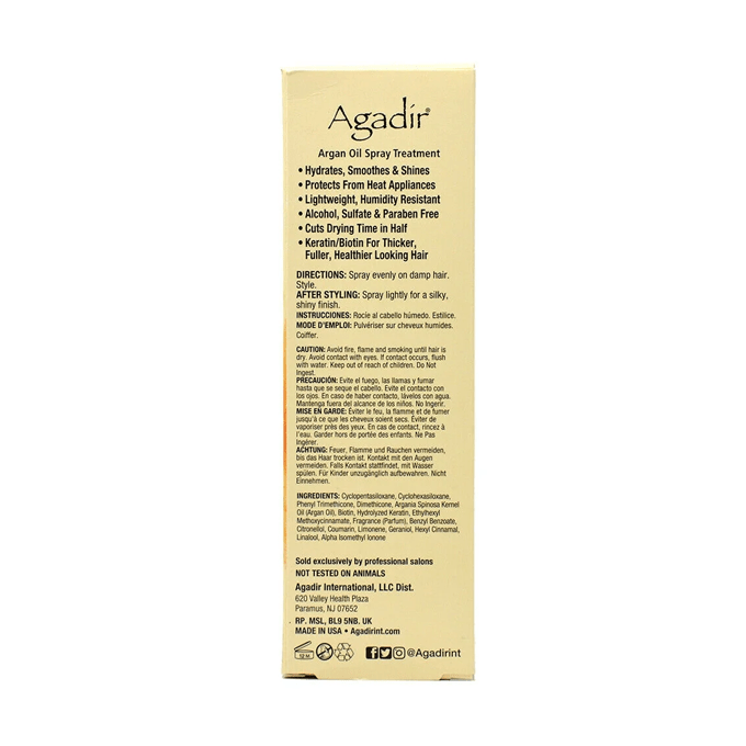 رشيه بالتساوي على شعرك الرطب و صففيه . بعد التصفيف رشي برفق للحصول على لمسة نهائية حريرية و لامعة .بخاخ زيت الأرجان المعالج من أغادير :معالج للشعر من ماركة أغادير، يأتي بشكل عملي على شكل بخاخ سبراي، ليسهل من عملية توزيعه على الشعر. يتميز بخاخ أغادير بتركيبة غنية بزيت الأرقان، حيث يقوم بحماية الشعر من حرارة أجهزة الشعر و المواد الكيمائية.بالإضافة إلى انه يقوم بترطيب و تنعيم الشعر والتقليل من التجاعيد و جفاف الشعر.بخاخ مثالي وصحي بفضل تركيبته الخفيفة على الشعرة ليجعل من عملية تسريح شعرك سهلة ومرتبة.أغادير متخصصه في منتجات العناية بالشعر التي صنعت لتدلل شعرك و تأخذك لعالم آخر من الإسترخاء و المتعه بالروائح الزكية. تتميز بإستخدام زيت الارغان في جميع منتجاتها ليرطب شعرك و يحسن صحته. لذلك صنعة لك بحب لتجعلك تعيشين متعة الإسترخاء و العناية بالشعر.