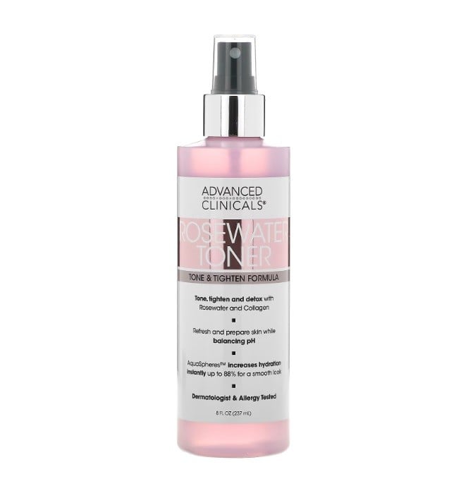 • قم بشد بشرتك وإزالة السموم منها باستخدام تونر الوجه المصنوع من ماء الورد والفحم. يعمل رذاذ التونر المنعش على تقليص مظهر المسام الواسعة.