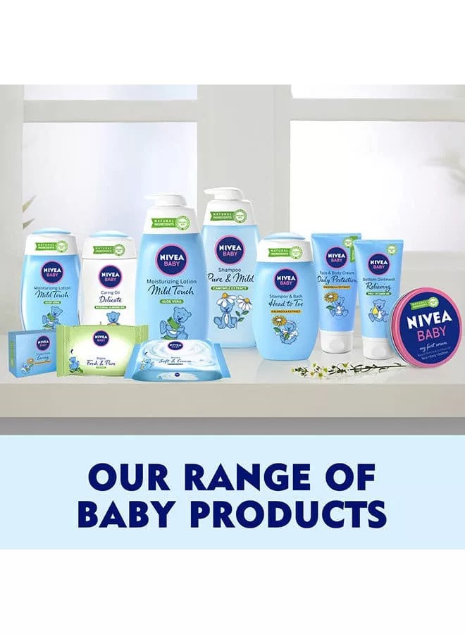 NIVEA Baby Pure and Mild Shampoo have been developed for a baby's sensitive scalp and hair. The mild formula with Camomile gently soothes and keeps the pH value of the scalp in balance. It cleanses hair and scalp extra gently leaving hair clean and soft. It is also gentle on the baby’s eyes and protects from tears. Ingredients- Aqua, Decyl Glucoside, Sodium Myreth Sulfate, PEG-200 Hydrogenated Glyceryl Palmate, Cocamidopropyl Betaine, Chamomilla Recutita Flower Extract, Bisabolol, Glycerin, Sodium Chloride, Citric Acid, Polyquaternium-10, Sodium Benzoate, Parfum. Allows for a tear-free experience and is as gentle to the eyes as pure water. Instantly unlock knots and tangles from your baby's hair. Rinses away easily leaving the skin and hair feeling clean, soft, and smooth. Extra mild and soft baby hair care product. Developed to gently cleanse both baby's delicate skin and fine hair without drying. Specification- Target Age Range- Little Baby. Colour Name- Blue. Product Dimension- 9x5.25x20 cm. Number of Pieces- 1. Detail Product List- 1 x Baby Shampoo.